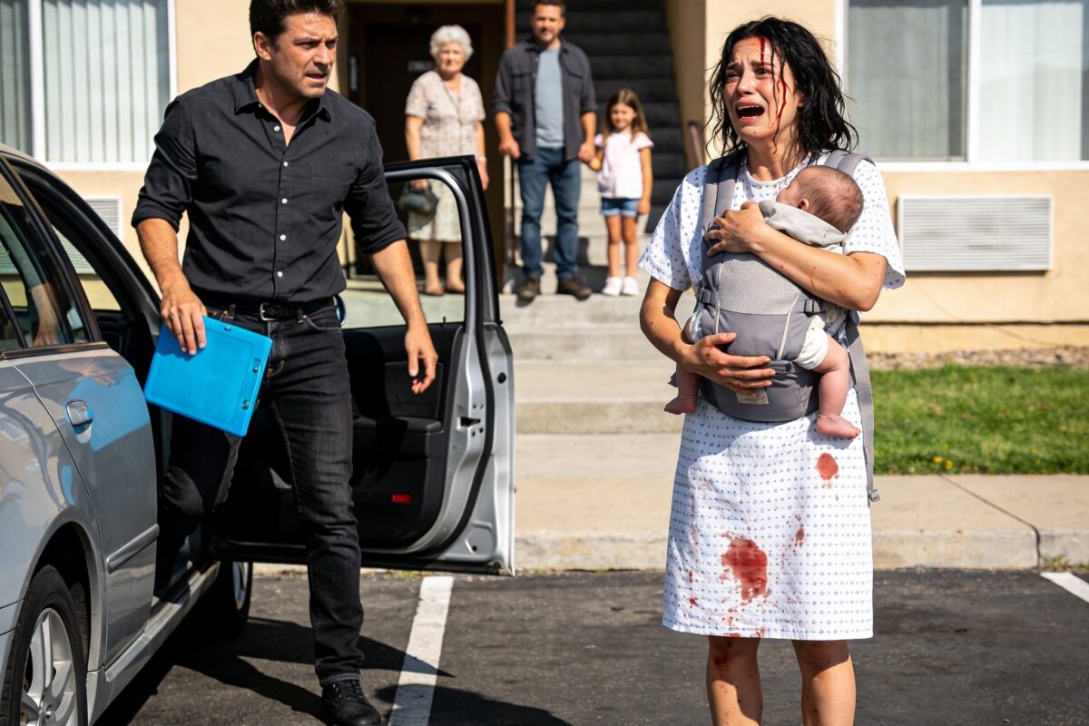 Mateo helped her sit down carefully, observing her condition with growing concern while trying to calm her with gentle words.